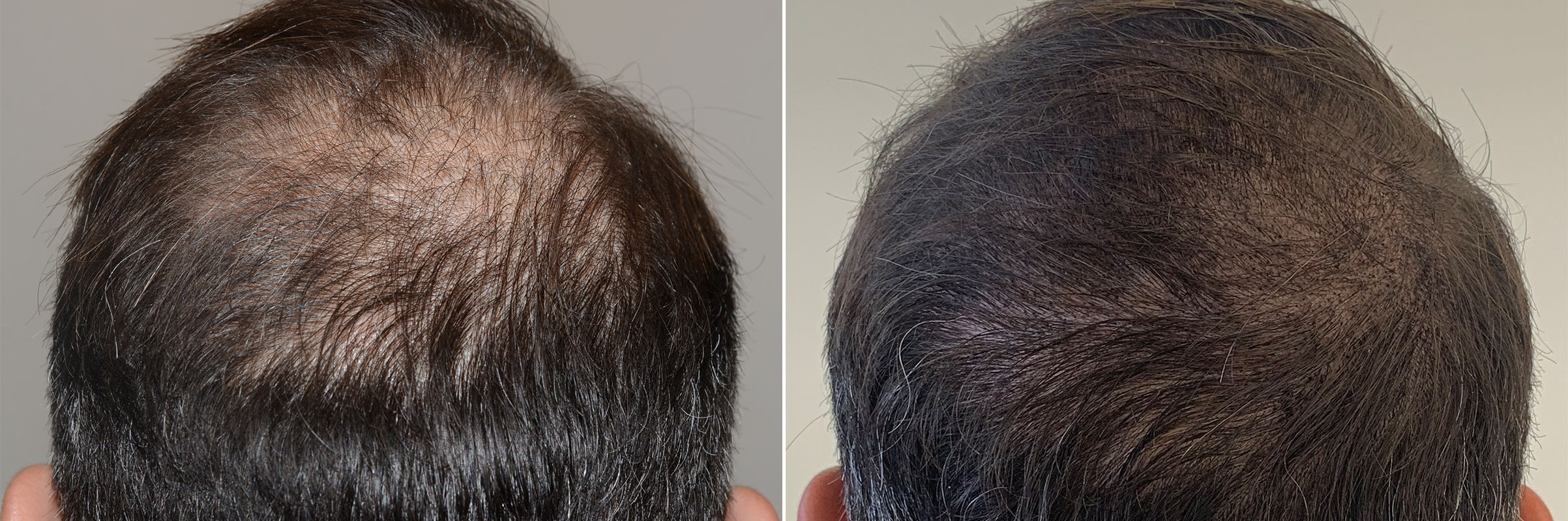 Before and after scalp micropigmentation into the crown to provide a fuller appearance.