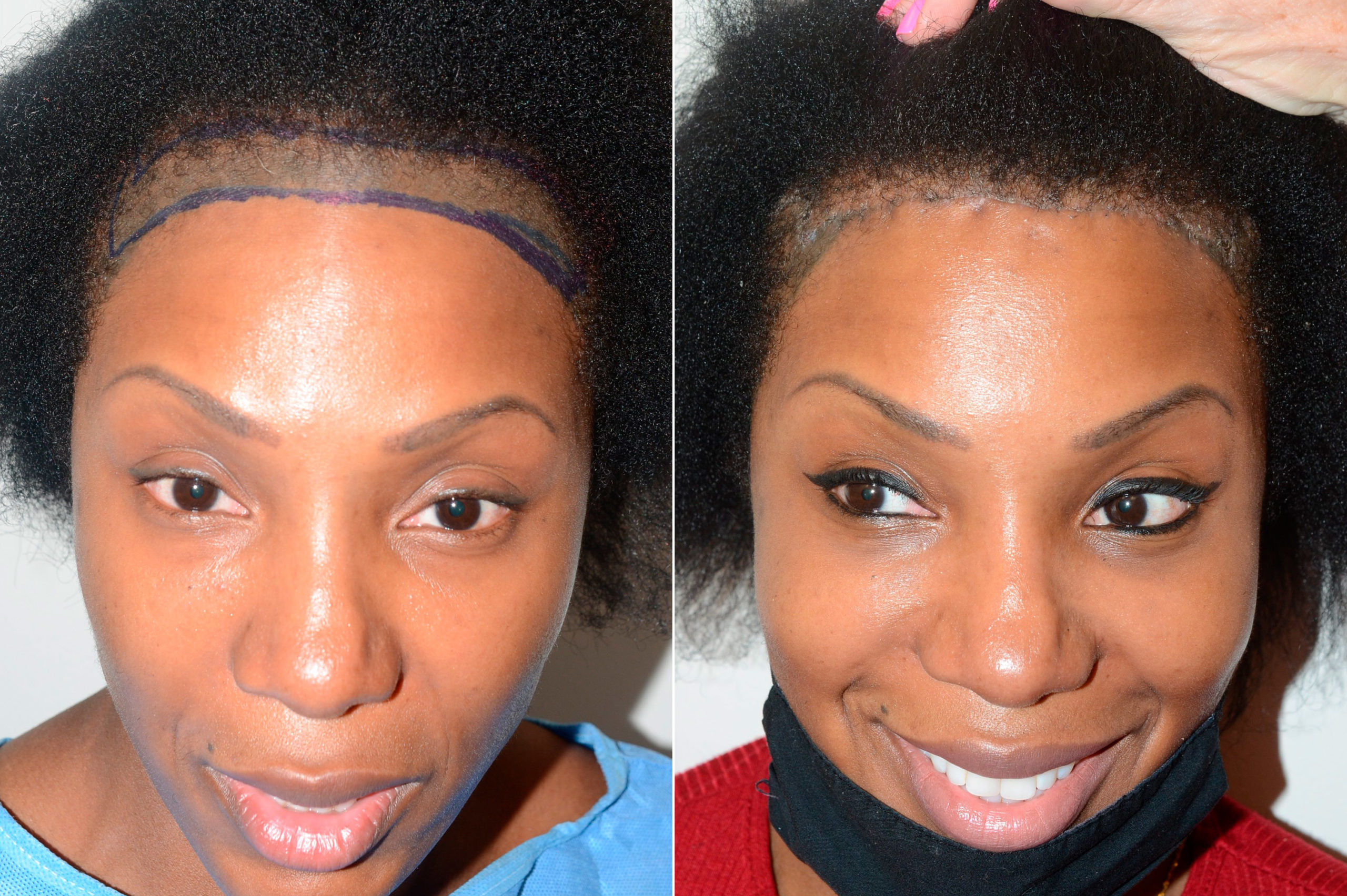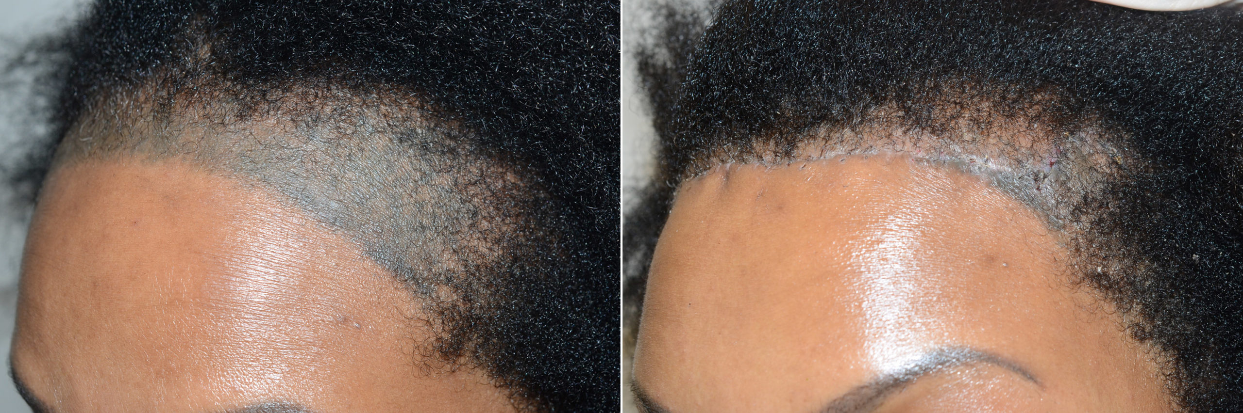 Este caso de reparacion implicó la realización de una cirugía de reducción de la línea del cabello para eliminar un tatuaje anterior. Al avanzar en el cuero cabelludo normal no tatuado con cabello, se podría lograr una apariencia mucho más natural.